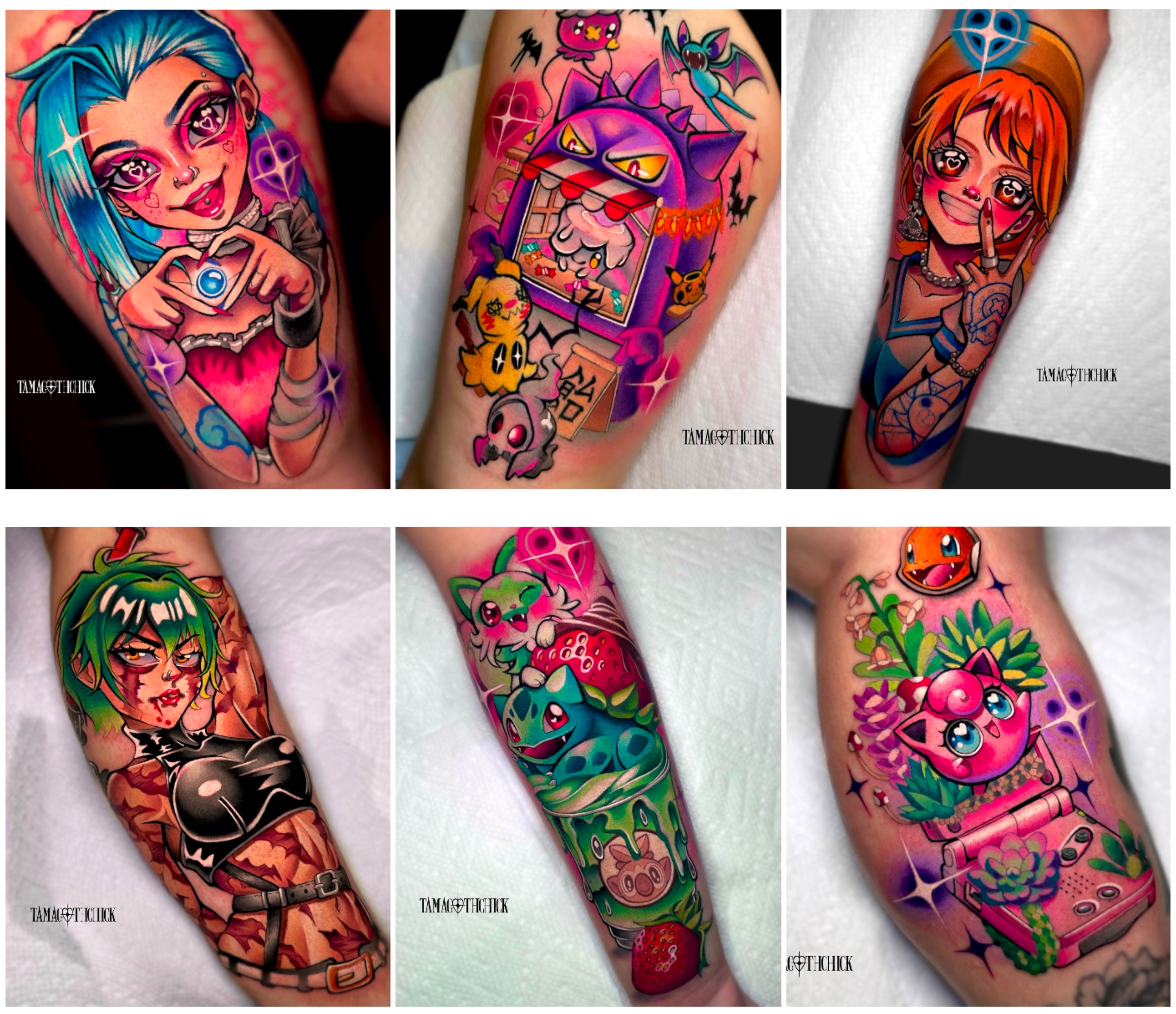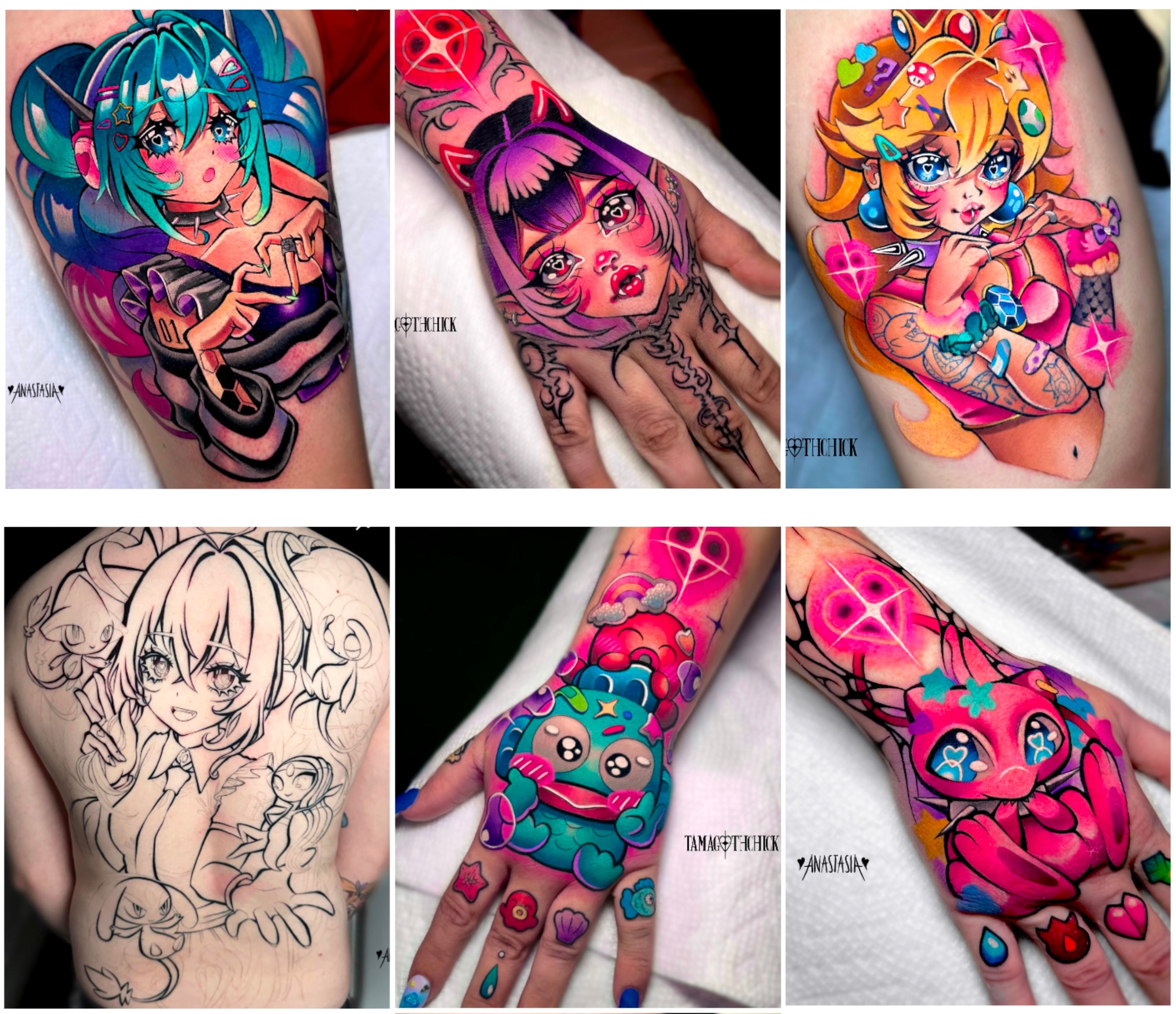 Dive into Anastasia's portfolio of anime and video game tattoos. Her artwork transcends ink on skin. It's a celebration of her love for Japanese animation, fashion and culture. Her work is heavily inspired by everything kawaii, manga and pop culture. To check out her full portfolio you can visit her Instagram page.